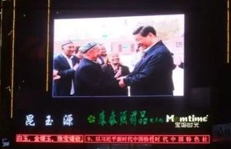 Das Treffen von Präsident Xi Jinping mit uigurischen Dorfbewohnern wird auf großen Bildschirmen auf einem Stadtplatz in Hotan übertragen |