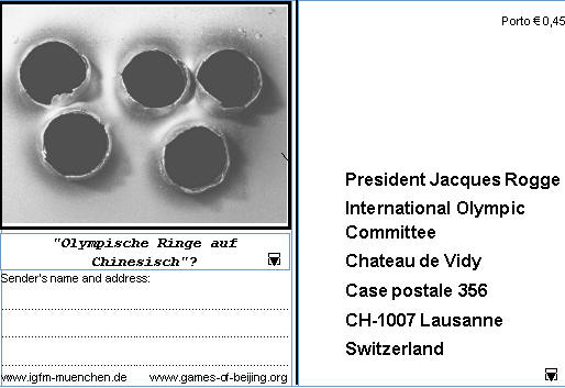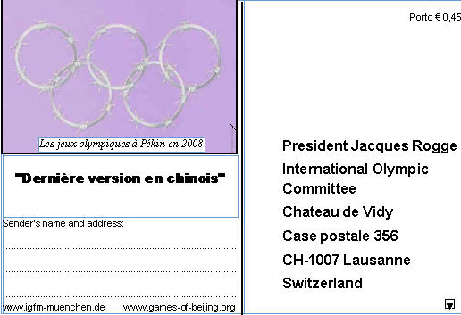 Bitte unterschreiben Sie die Postkarten und schicken Sie sie an den IOC Präsidenten Jacques Rogge oder schreiben Sie ihm in ihren eigenen Worten einen Brief.