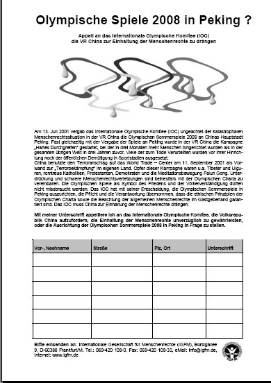Am 13. Juli 2001 vergab das Internationale Olympische Komitee (IOC) ungeachtet der katastrophalen Menschenrechtssituation in der VR China die Olympischen Sommerspiele 2008 an Chinas Hauptstadt Peking. Fast gleichzeitig mit der Vergabe der Spiele an Peking wurde in der VR China die Kampagne "Hartes Durchgreifen" gestartet, bei der in drei Monaten mehr Menschen hingerichtet wurden als in der gesamten übrigen Welt in drei Jahren zuvor. Viele der zum Tode Verurteilten wurden vor ihrer Hinrichtung noch der öffentlichen Demütigung in Sportstadien ausgesetzt. China benutzte den Terroranschlag auf das World Trade Center am 11. September 2001 als Vorwand zur "Terrorbekämpfung" im eigenen Land. Opfer dieser Kampagne waren u.a. Tibeter und Uiguren, romtreue Katholiken, Protestanten, Demokraten und die Meditationsbewegung Falun Gong. Unterdrückung und schwere Menschenrechtsverletzungen sind keinesfalls mit der Olympischen Charta zu vereinbaren. Die Olympischen Spiele als Symbol des Friedens und der Völkerverständigung dürfen nicht mißbraucht werden. Das IOC hat mit seiner Entscheidung, die Olympischen Sommerspiele in Peking auszurichten, die Pflicht und die Verantwortung übernommen, daß die ethischen Prinzipien der Olympischen Charta sowie die Beachtung der allgemeinen Menschenrechte im Gastgeberland garantiert sind. Das IOC muss China zur Einhaltung der Menschenrechte drängen.
